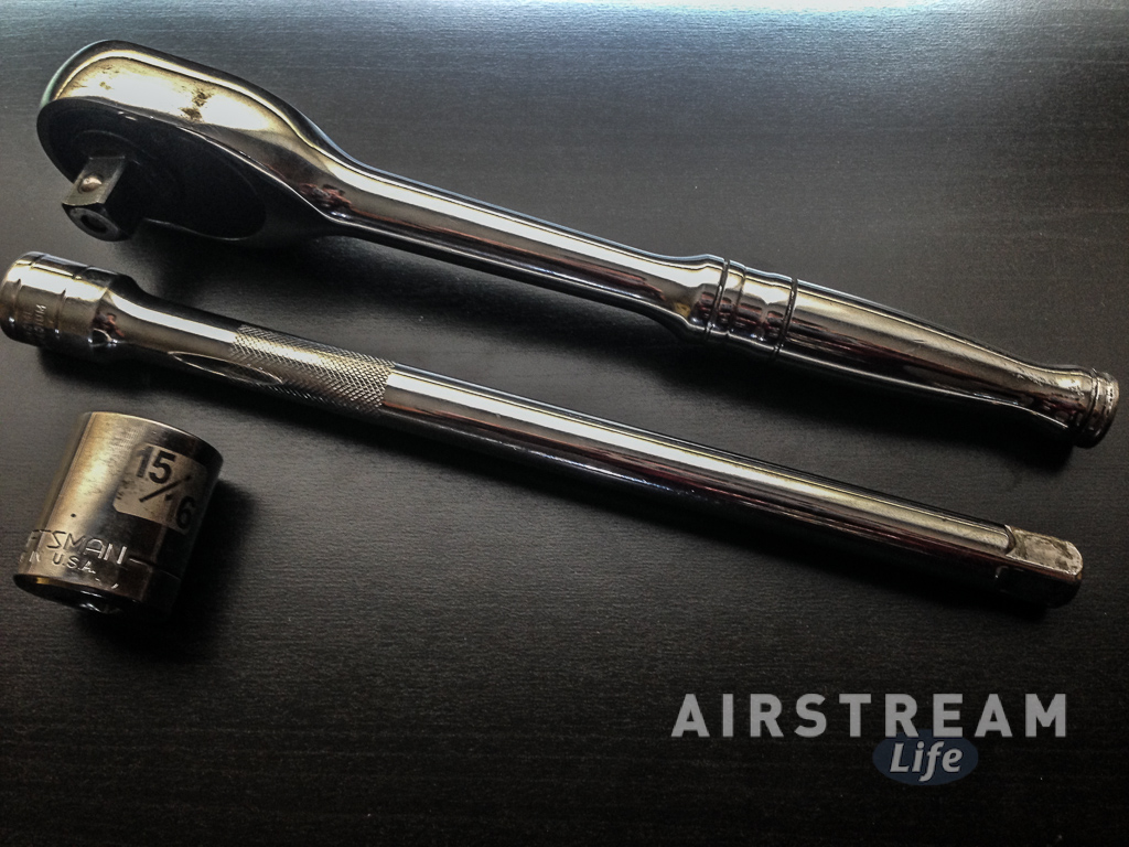 If you have the Airstream Life Tire Changing Kit, you already have the extension and a "breaker bar" that will substitute for the ratchet wrench in a pinch. All you need in that case is a 15/16″ socket (1/2″ drive), which you can get at a hardware store.